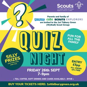 1st Tidbury Green Scouting Families Click on the image below to book your tickets for our Fundraising Quiz Night!